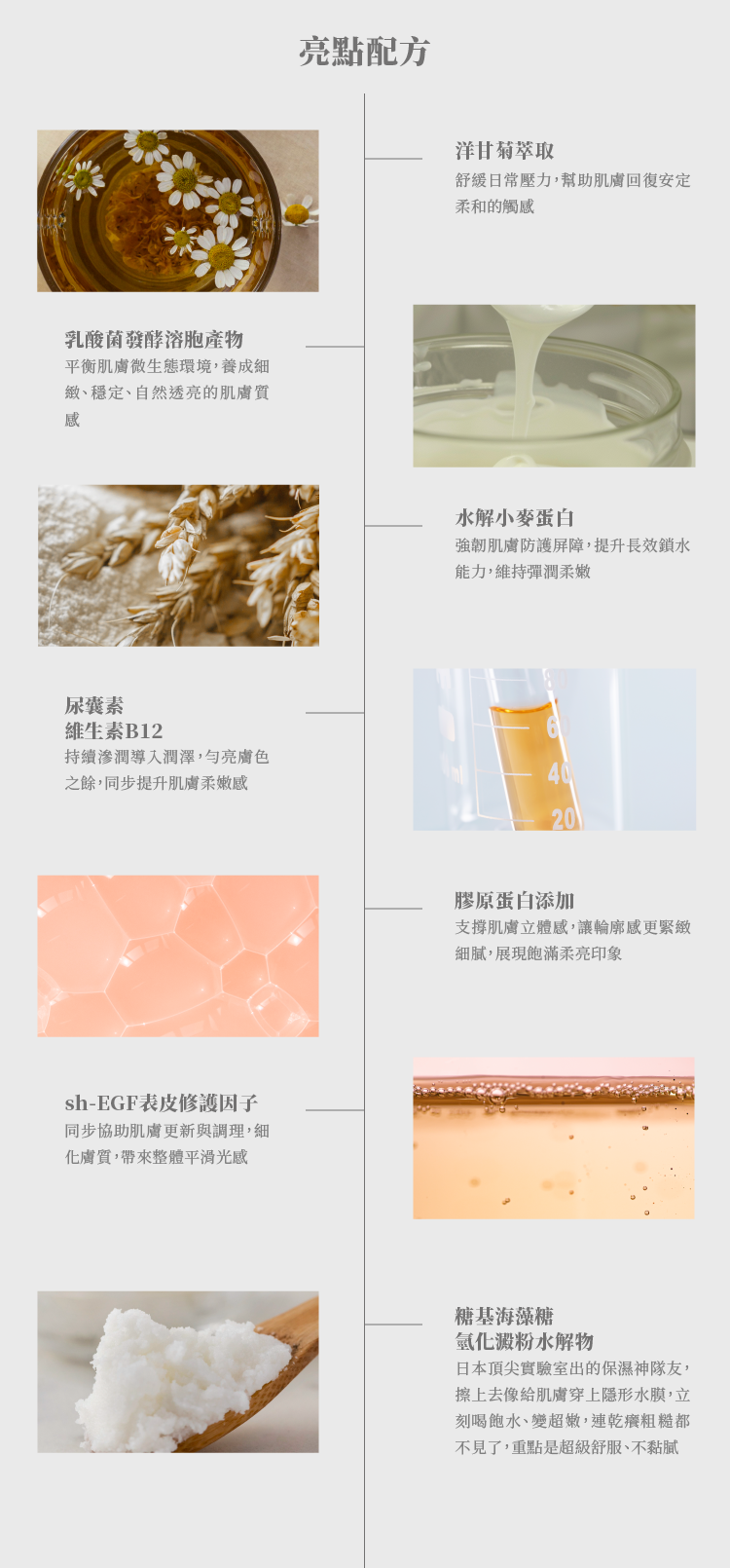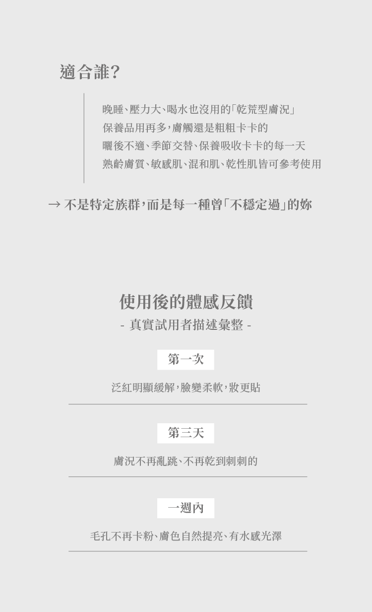 從研發第一天起,我們就為每款產品設定了它在「養膚節奏」中的位置與使命,讓它們在肌膚的不同階段發揮專屬作用。
