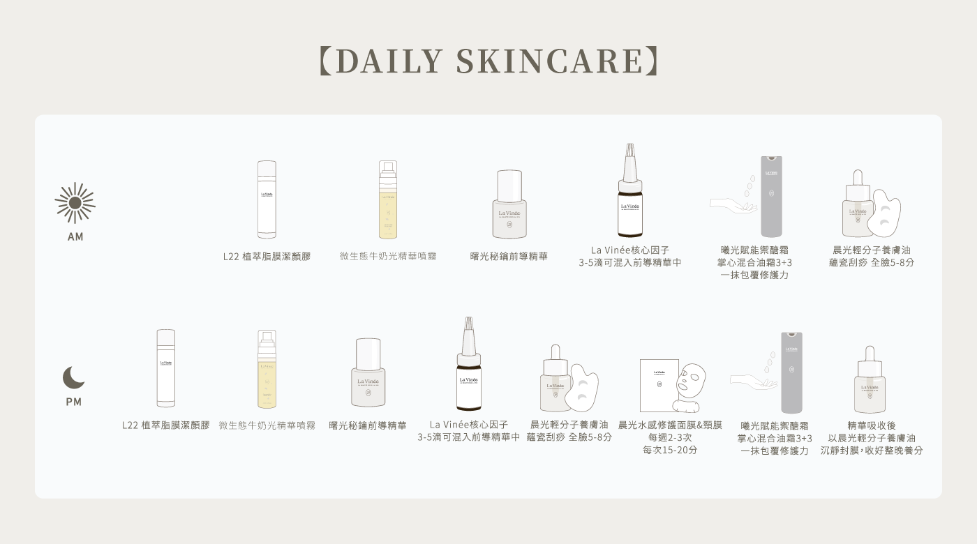 在 La Vinée,我們不追求繁瑣的堆疊,我們在乎的是「剛剛好的修護」。針對亞洲潮濕氣候研發,我們捨棄了厚重的黏膩感,取而代之的是絲緞般的吸收速度與深層的底氣修護。