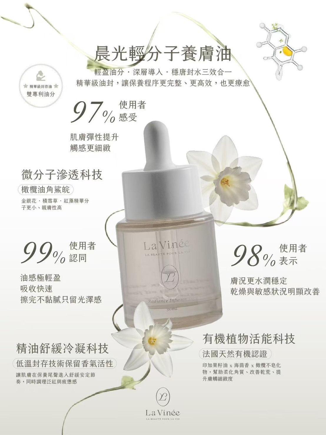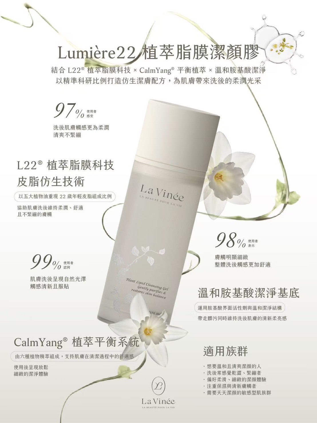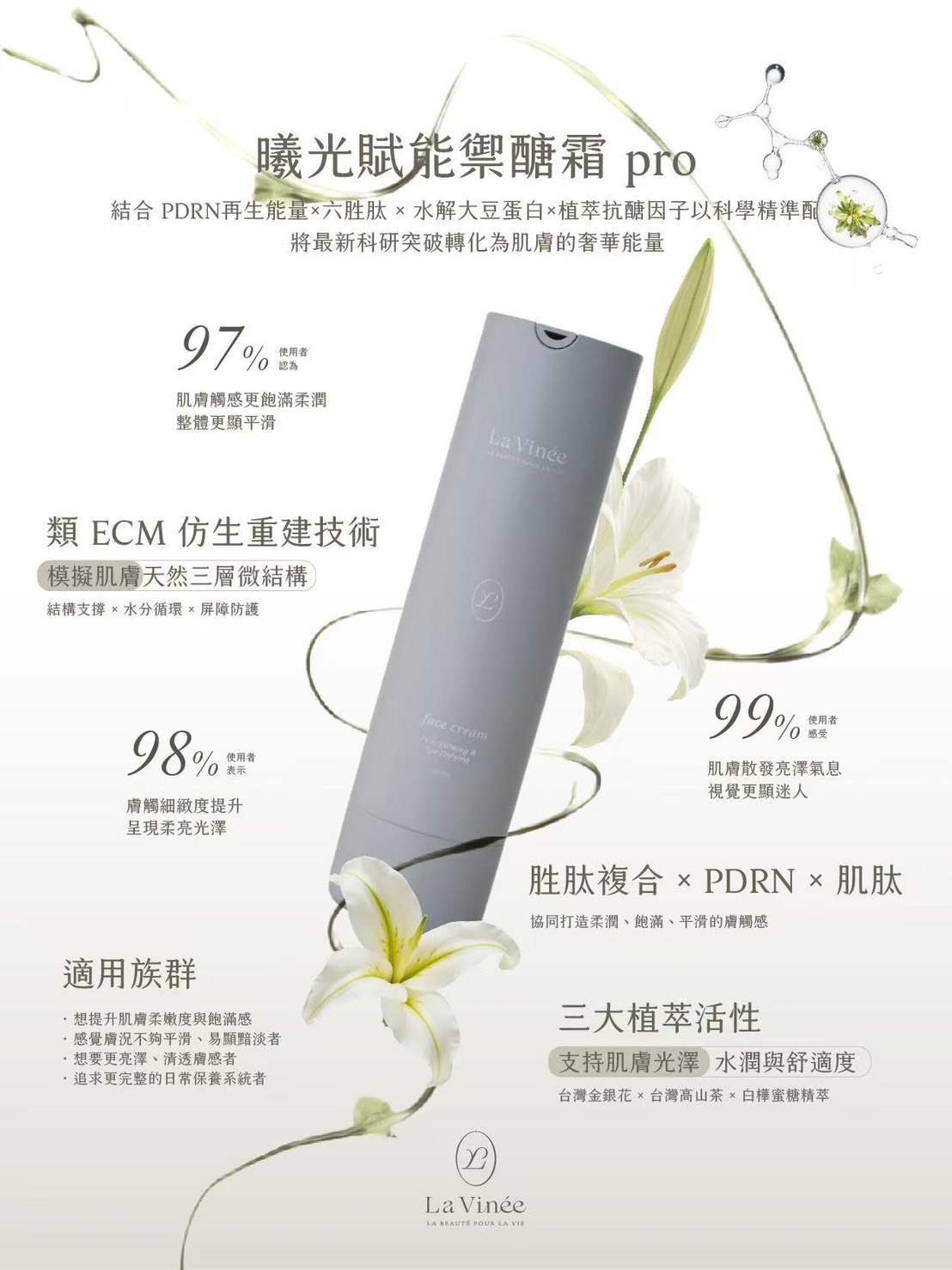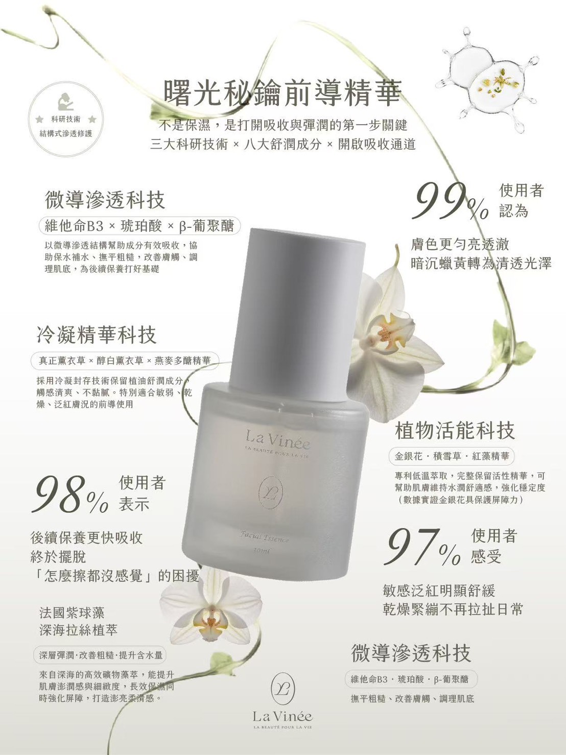 在 La Vinée,我們不追求繁瑣的堆疊,我們在乎的是「剛剛好的修護」。針對亞洲潮濕氣候研發,我們捨棄了厚重的黏膩感,取而代之的是絲緞般的吸收速度與深層的底氣修護。