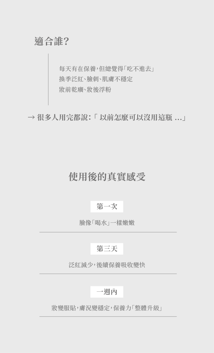 從研發第一天起,我們就為每款產品設定了它在「養膚節奏」中的位置與使命,讓它們在肌膚的不同階段發揮專屬作用。